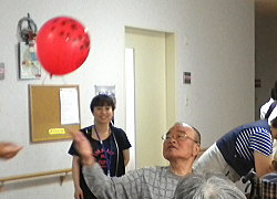| カルタ取りの合間の語らい | 風船飛ばしゲーム、上手です。 |