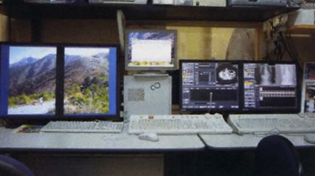 左からPACSモニター2面、電子カルテ、CTモニターです。