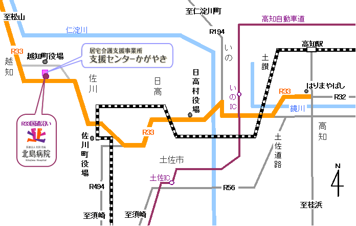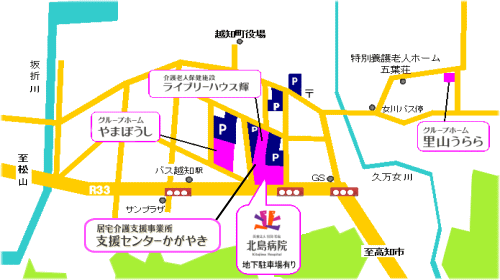 黒岩観光バスに乗り換え越知駅下車、国道沿いを高知方面へ徒歩3分、